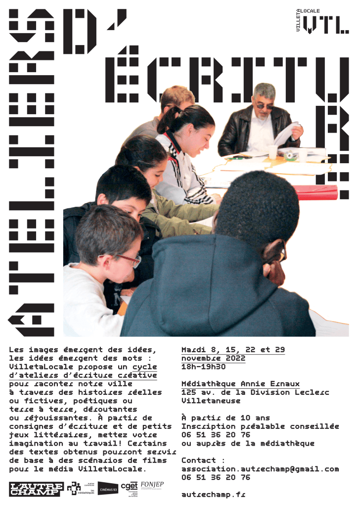 A partir de consignes d’écriture et de jeux littéraires simples, il vous sera proposé un temps d’écriture créative accessible à tous.tes. L’envie d’écrire et de se laisser emporter par ses rêveries littéraires sont les seuls pré-requis pour cet atelier ! Pour celles et ceux qui le souhaitent, ces textes pourront servir de bases à des futurs scénarios de films réalisés dans le cadre du média VilletaLocale.