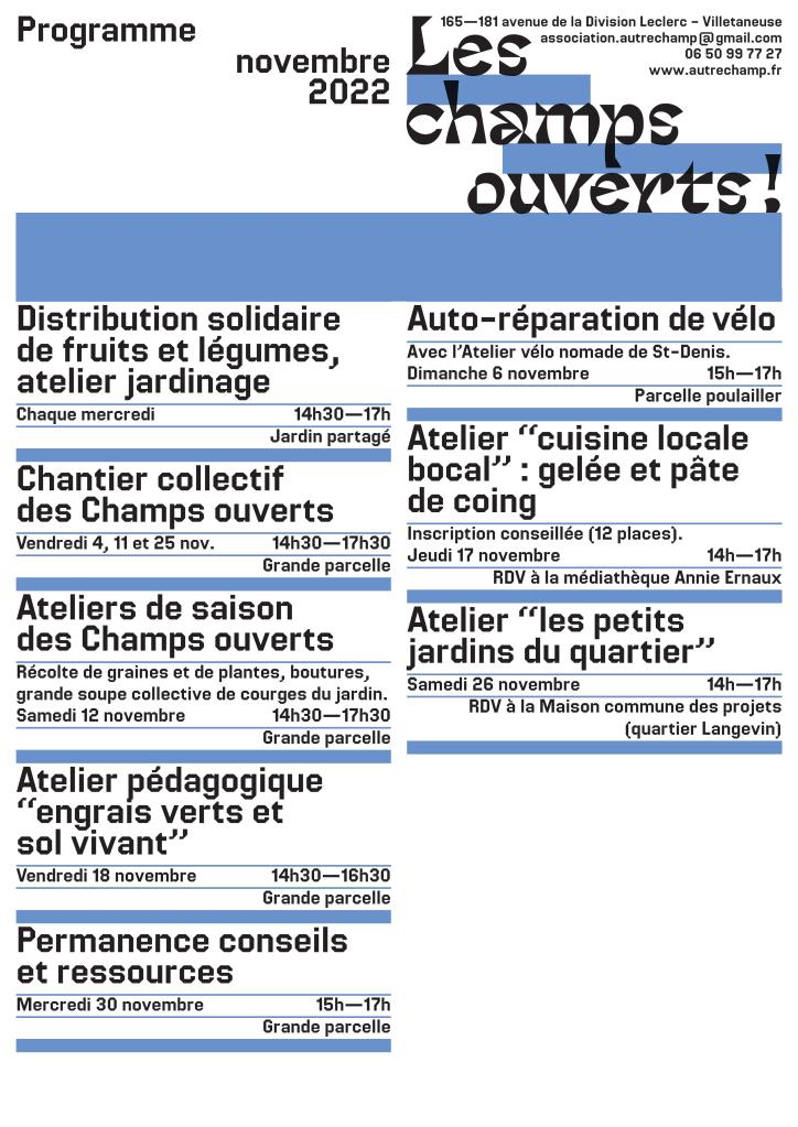 Après un mois d’octobre quasi estival, on profite des dernières récoltes de légumes et on prépare les prochaines cultures aux champs ouverts. Au programme au jardin : plantations d’ail, oignons, fèves et engrais verts ; récoltes de graines et réalisation de boutures. Côté cuisine, retrouvez-nous pour la préparation d’une grande soupe collective avec les courges du jardin ou bien pour l’atelier de transformation des premiers coings produits sur nos parcelles. Et comme d’habitude, retrouvez chaque semaine la distribution solidaire de fruits et légumes.