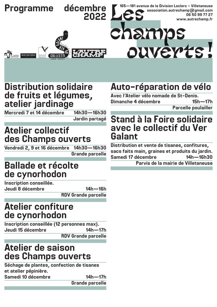 Après avoir (enfin!) cueilli les dernières tomates de la saison, le jardin se prépare à passer l’hiver : nettoyage des cultures d’été, couverture du sol, paillage… Côté cuisine ce mois-ci, on cueille le cynorhodon pour en faire de la confiture. L’Autre Champ et le collectif du Ver Galant partageront aussi un stand à la Foire Solidaire de Villetaneuse le 17 décembre où vous pourrez retrouver les produits du jardin (tisane, courge…). Et comme d’habitude, on se retrouve chaque semaine à la distribution solidaire de fruits et légumes et ce dimanche 4 décembre à l’atelier d’auto-réparation de vélo. Pour voir les photos des semaines précédentes aux jardins, cliquez ici.