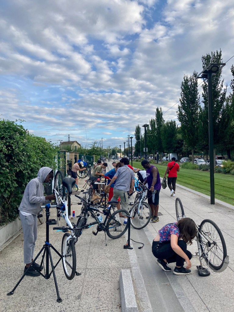 Tout avait débuté lors de la première édition du festival Plein champ en septembre 2020, avec un atelier d’auto-réparation de vélo tout au long du week-end et la séance de clôture du festival, dont le film avait été projeté grâce à un dispositif autonome en énergie, alimenté par un vélo. Depuis, des ateliers d’auto-réparation se tiennent régulièrement aux champs ouverts de Villetaneuse, encadrés par des bénévoles de l’association et des membres du collectif « atelier vélo nomade » de Saint-Denis. L’été dernier, et jusqu’en octobre 2022, le rendez-vous était même hebdomadaire.