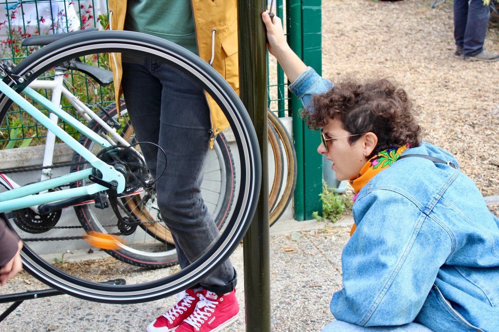 Ainsi, alors que l’expérimentation ne devait durer qu’un temps, les ateliers d’auto-réparation font désormais partie de notre programmation. Installé devant la parcelle du poulailler des champs ouverts, l’atelier attire souvent beaucoup de cyclistes, de tout horizon et de tout âge. Il faut dire que les besoins sont nombreux, tant les espaces pour réparer son bicloune sont quasi inexistants dans nos territoires. Basé sur l’entraide, la gratuité et l’autogestion, le principe de l’auto-réparation est de permettre la transmission et l’autonomie de chacun.e en matière d’entretien et de réparation. L’atelier met juste à disposition des outils et des pièces de rechanges, en présence de personnes plus aguerries qui peuvent donner quelques conseils si besoin.