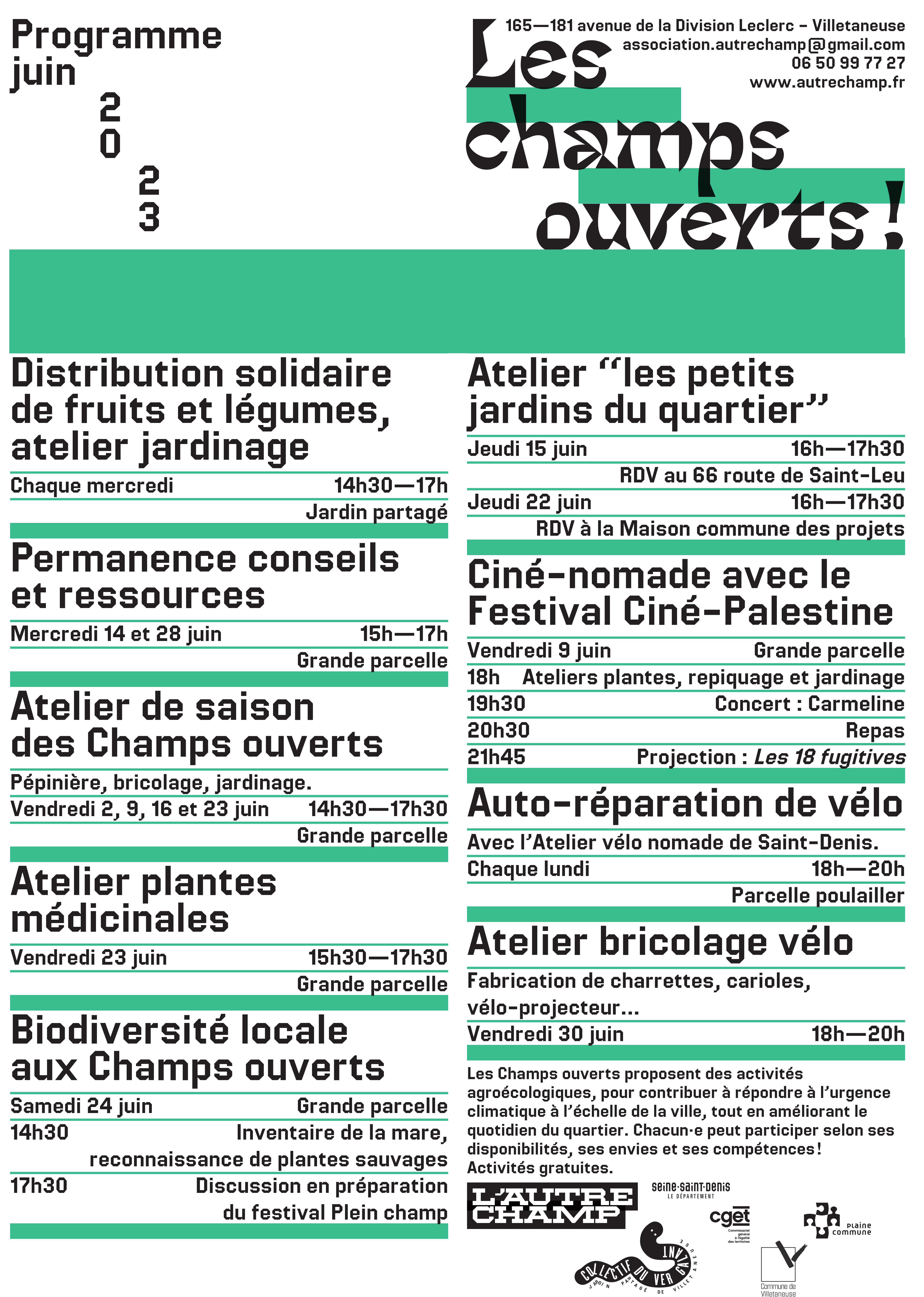 Aux jardins, les parcelles accueillent les cultures d’été et le mandala de plantes médicinales est presque tout en fleurs. Ce mois-ci : plusieurs ateliers autour des plantes médicinales les 9 juin et 23 juin et une après-midi sur la biodiversité locale le 24 juin. Côté vélo, en plus du rendez-vous d’auto-réparation hebdomadaire du lundi soir, on bricolera charrettes, carrioles et vélo-projecteur le vendredi 30 juin. Et comme d’habitude, retrouvez chaque mercredi l’atelier jardinage et la distribution solidaire de fruits et légumes au jardin partagé, avec le collectif du Ver galant. N’hésitez pas à venir quand bon vous semble, les ateliers sont gratuits et ouverts à tous.tes.