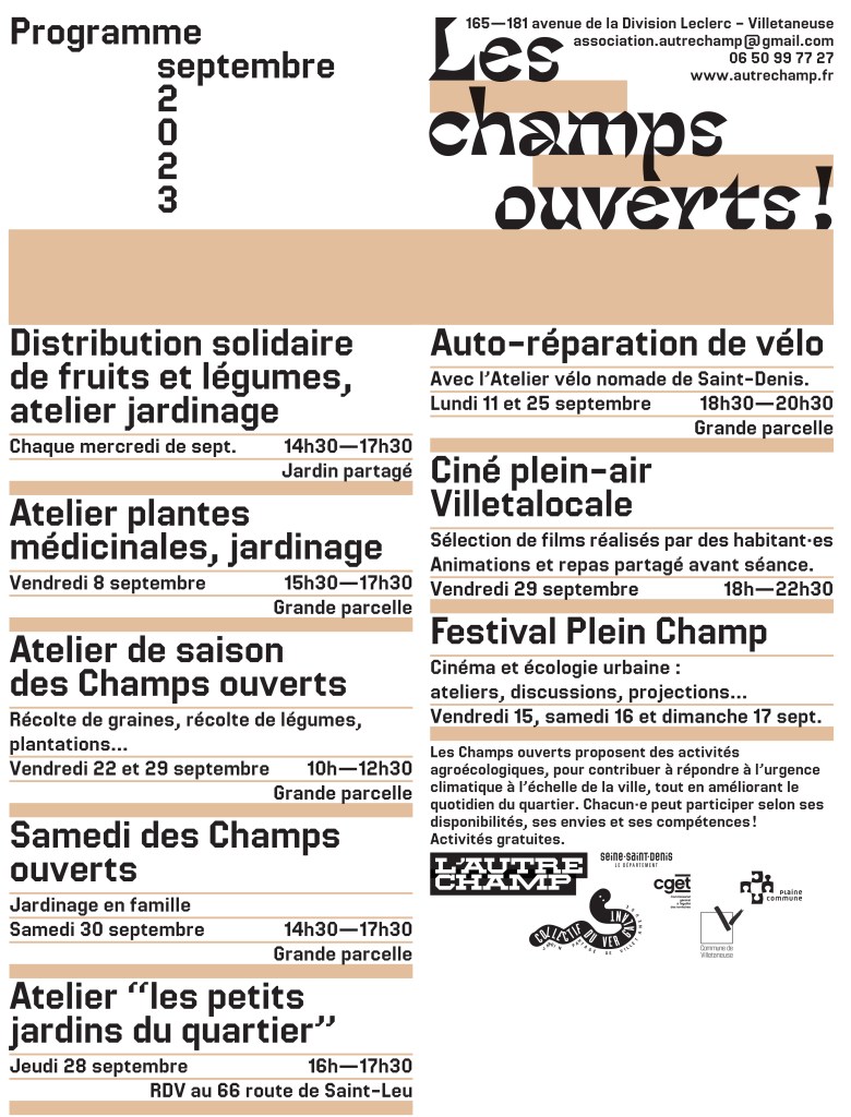 Après quelques semaines de répit estival, les champs ouverts reprennent de plus belle avec un atelier plantes médicinales (vendredi 8 septembre), des ateliers vélo (lundi 11 et 25 septembre), la distribution solidaire de fruits et légumes tous les mercredis et des temps de jardinages collectifs et familiaux les vendredis et le samedi 30 septembre. Sans oublier notre grand rendez-vous de l’année pour le festival Plein Champ les 15, 16 et 17 septembre!