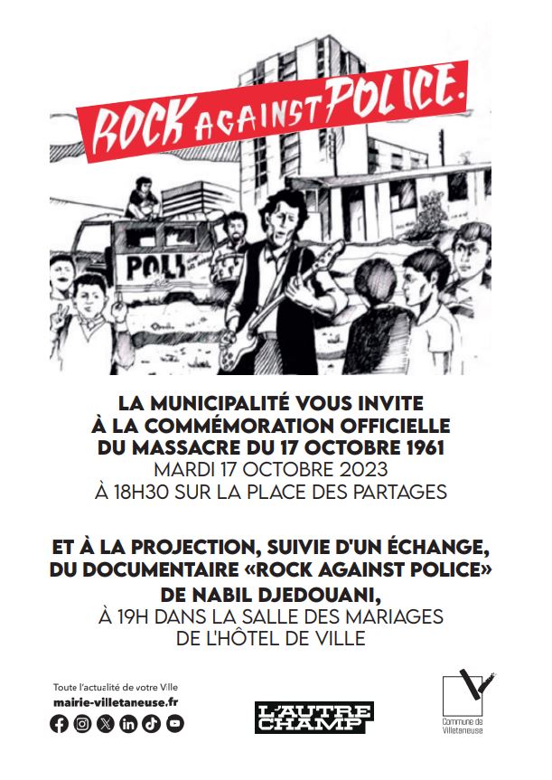 En souvenir des victimes du massacre du 17 octobre 1961 perpétué par la police française, le mardi 17 octobre 2023, la municipalité de Villetaneuse et l’association de l’Autre Champ proposent la projection du film documentaire « Rock Against Police » de Nabil Djedouani à 19h dans la salle des mariages de l’hôtel de ville, suivie d’un échange avec des invité.e.s (un historien de l’université Paris 13 et une protagoniste du film – sous réserve-)