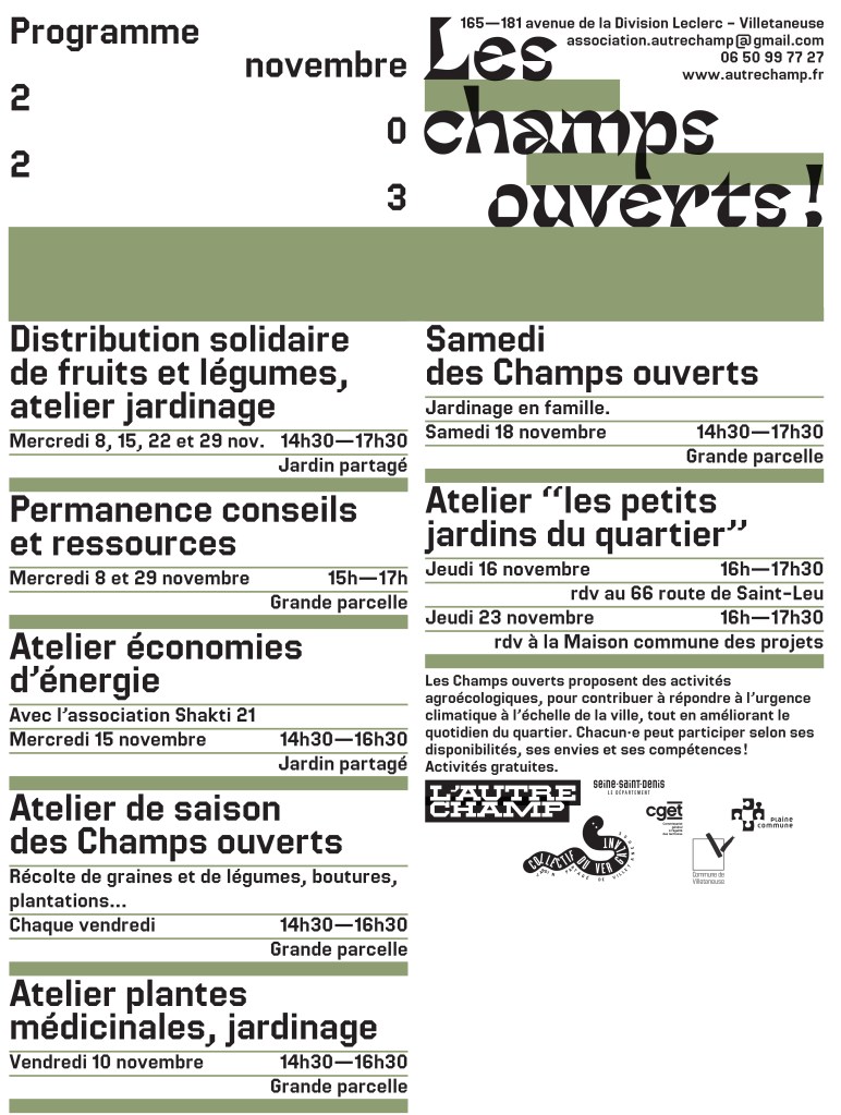 Les derniers plants de tomates et d’aubergines ont été retirés, remplacées par les engrais verts et les cultures d’hiver. Encore plein d’activités à venir ce mois-ci, malgré le froid qui s’installe enfin : des temps de jardinages collectifs tous les vendredis et la distribution solidaire de fruits et légumes les mercredis, un atelier plantes médicinales pour préparer son corps à l’hiver (vendredi 10 novembre), du jardinage en famille et un atelier de transformation (samedi 18 novembre). A bientôt aux jardins!