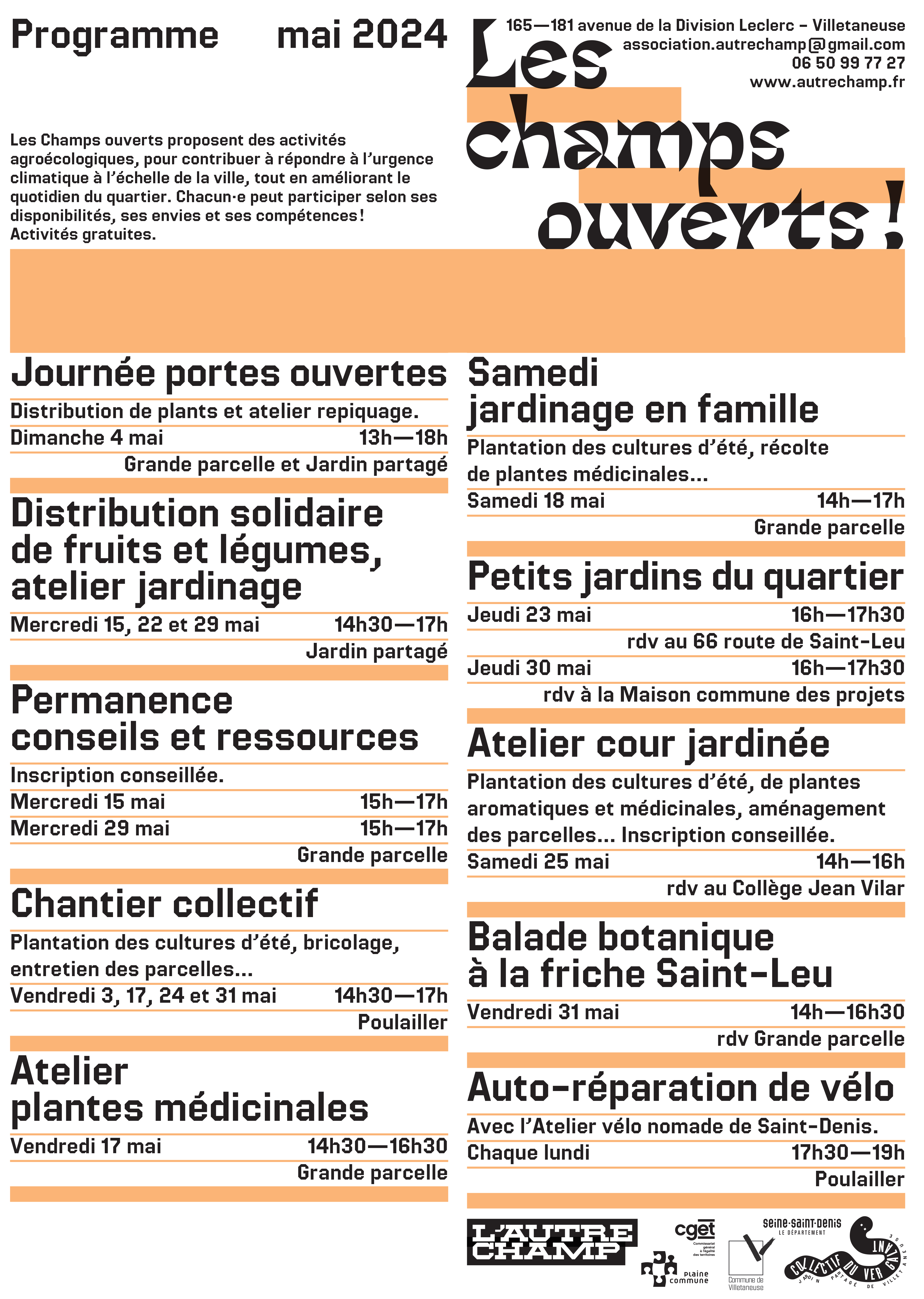 Le mois de mai s’annonce bien rempli d’activités avec : des plantes médicinales les vendredis 17 et samedi 18 mai, un atelier cour jardinée au collège Jean Vilar le samedi 25 mai, les petits jardins du quartier les jeudis 23 et 30 mai… Sans oublier les rdv hebdomadaires : l’atelier d’auto-réparation de vélo le lundi, la distribution solidaire et l’atelier jardinage le mercredi et les chantiers collectifs des champs ouverts tous le vendredi.