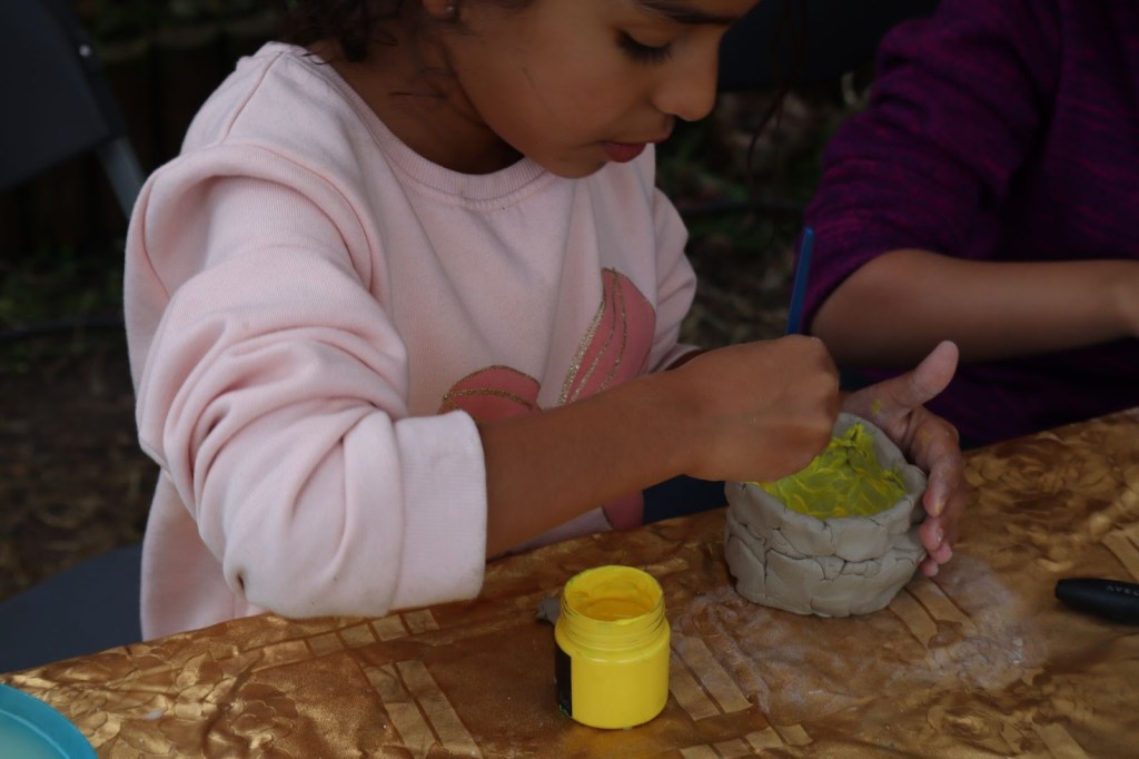 Après de belles journées de montage, le festival s’est ouvert au public le vendredi 26 septembre en fin d’après-midi avec une programmation déjà bien dense, rythmée par l’engouement collectif pour la première thématique autour des luttes des femmes et minorités de genre pour la terre. Au mandala des plantes médicinales s’est tenu l’atelier sur le soin autour des plantes et de la ménopause; dans la contre-allée s’est lancé le chantier permanent du festival qui consistait en la réalisation d’une fresque collective (sur plusieurs panneaux en bois) pour raconter le jardin et embellir ses entrées; à l’espace création, une nuée d’enfants participaient à l’atelier de land art et d’empreintes végétales dans l’argile.